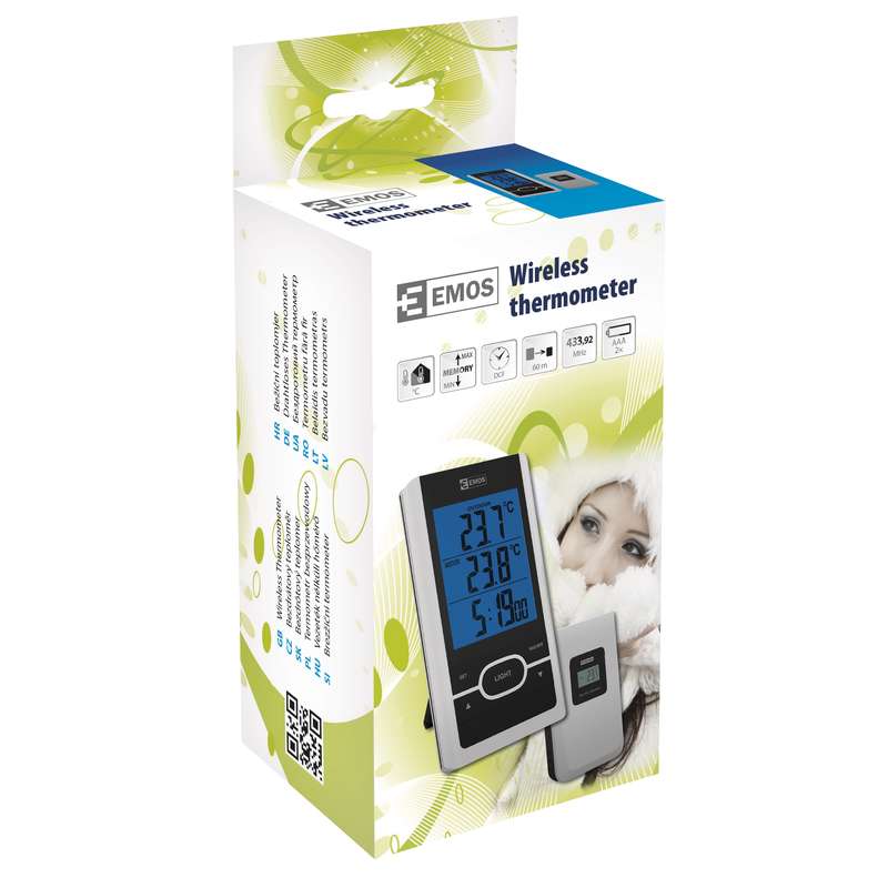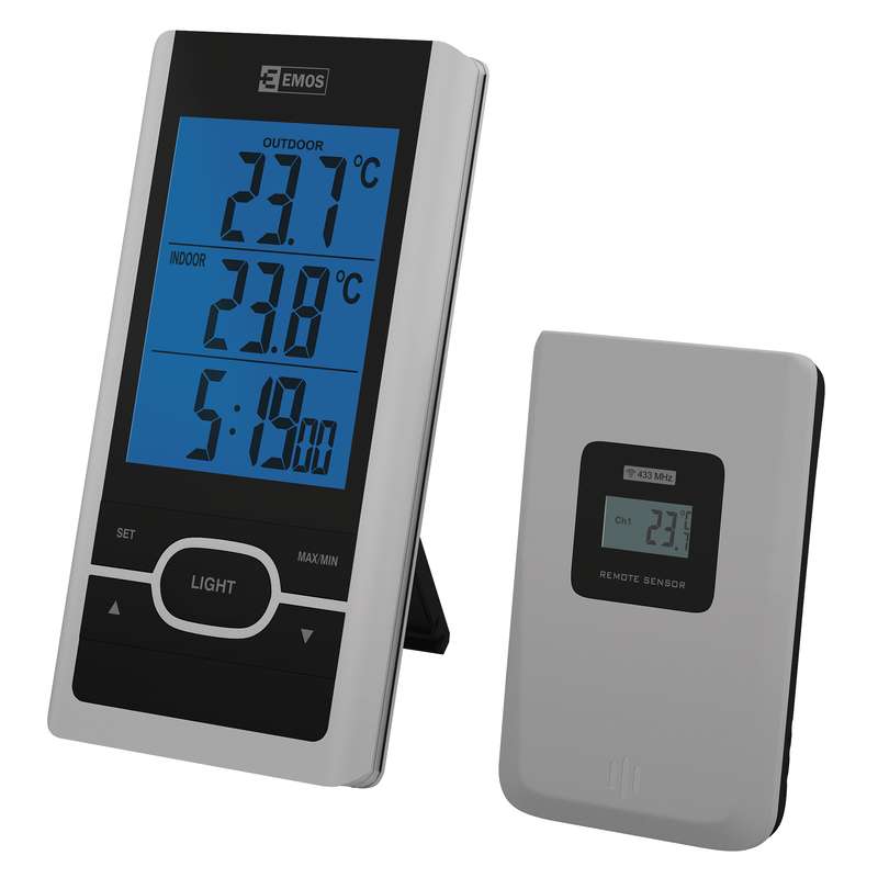 Bezdrôtový teplomer s modrým podsvietením displeja. K teplomeru sa